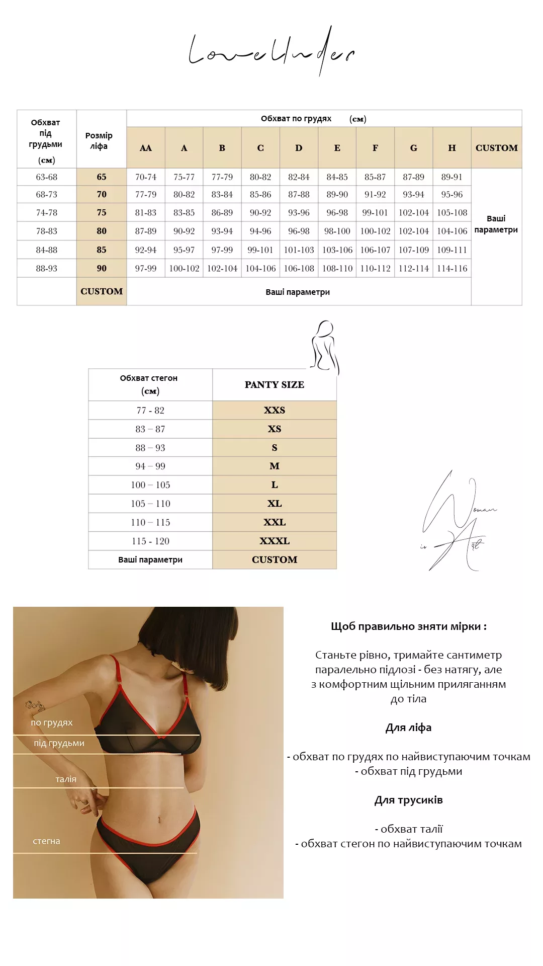 Якщо у Вас є запитання щодо фасону, кольору або розміру – будь ласка, зв’яжіться з нами через контактну форму на сторінці товару, на стронці інстаграм @loveunder_lingerie або за будь-яким зручним каналом зв’язку з розділу Контакти.