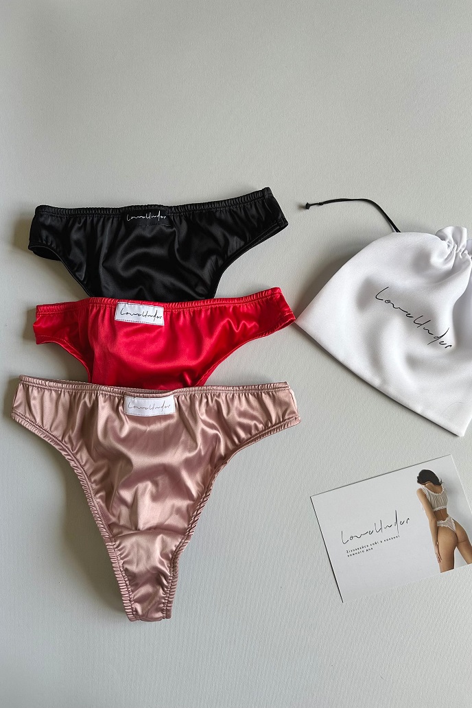 Сатинові стрінг високої посадки. Ви можете додати до замовлення додаткову пару трусиків будь-якої форми та посадки за Вашим бажанням – сліп/стрінг/бразиліана, високої або класичної посадки.