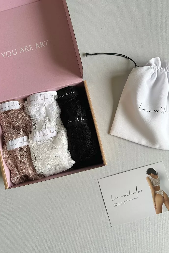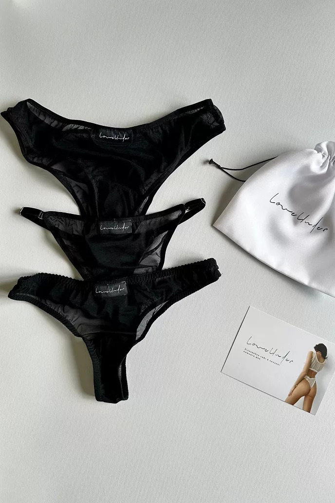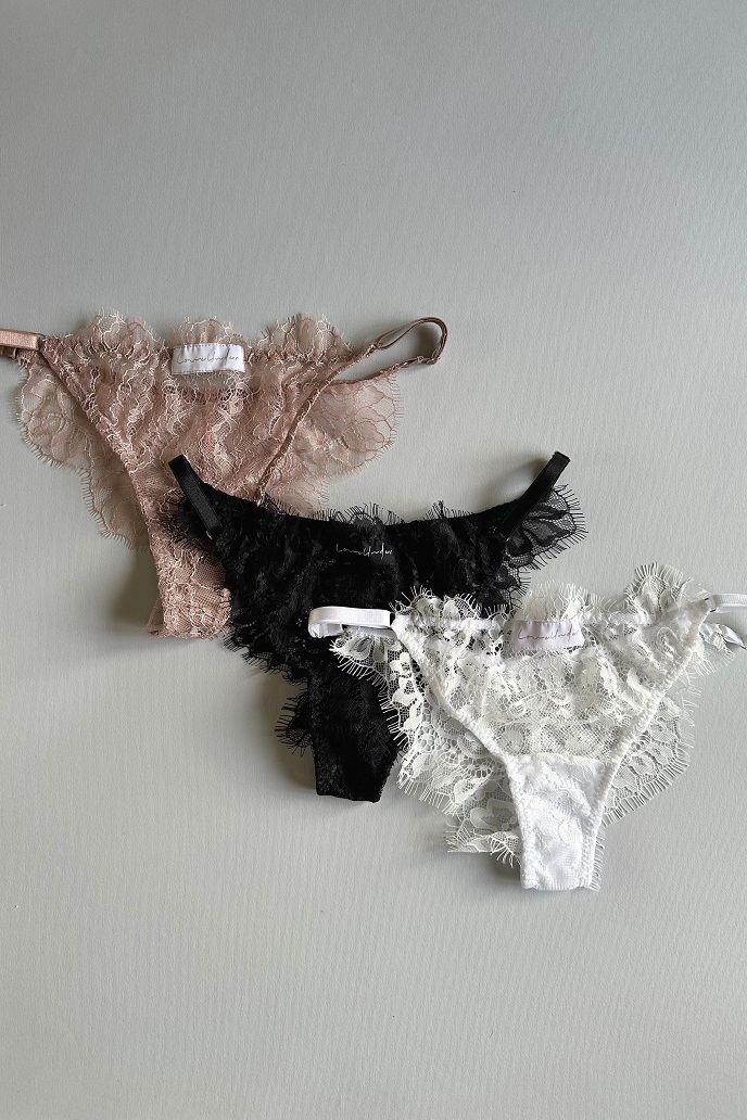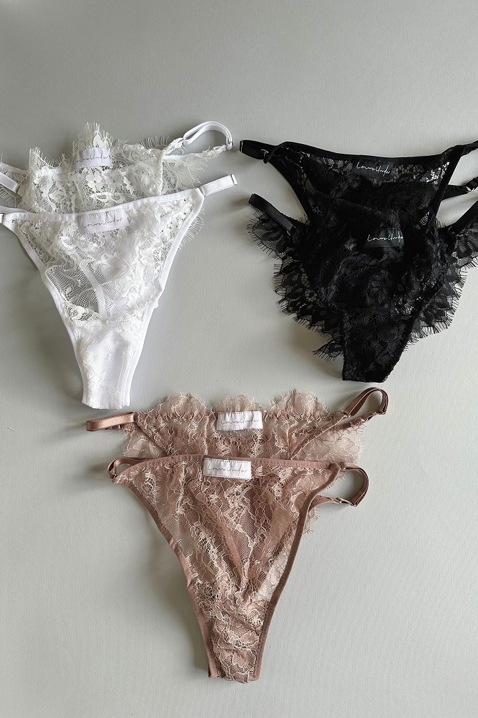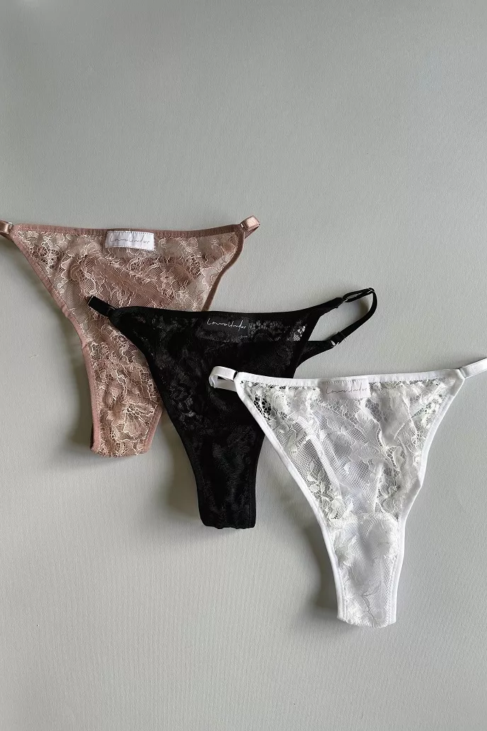 Мереживні трусики стрінг високої посадки та бразиліана класичної посадки з лого та регуляцією з боків/ 3 шт стрінг та 3 бразиліана. Кольори – білий, чорний, пудровий.