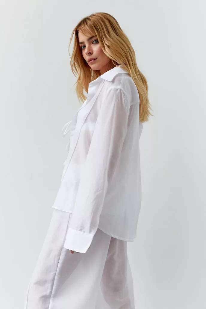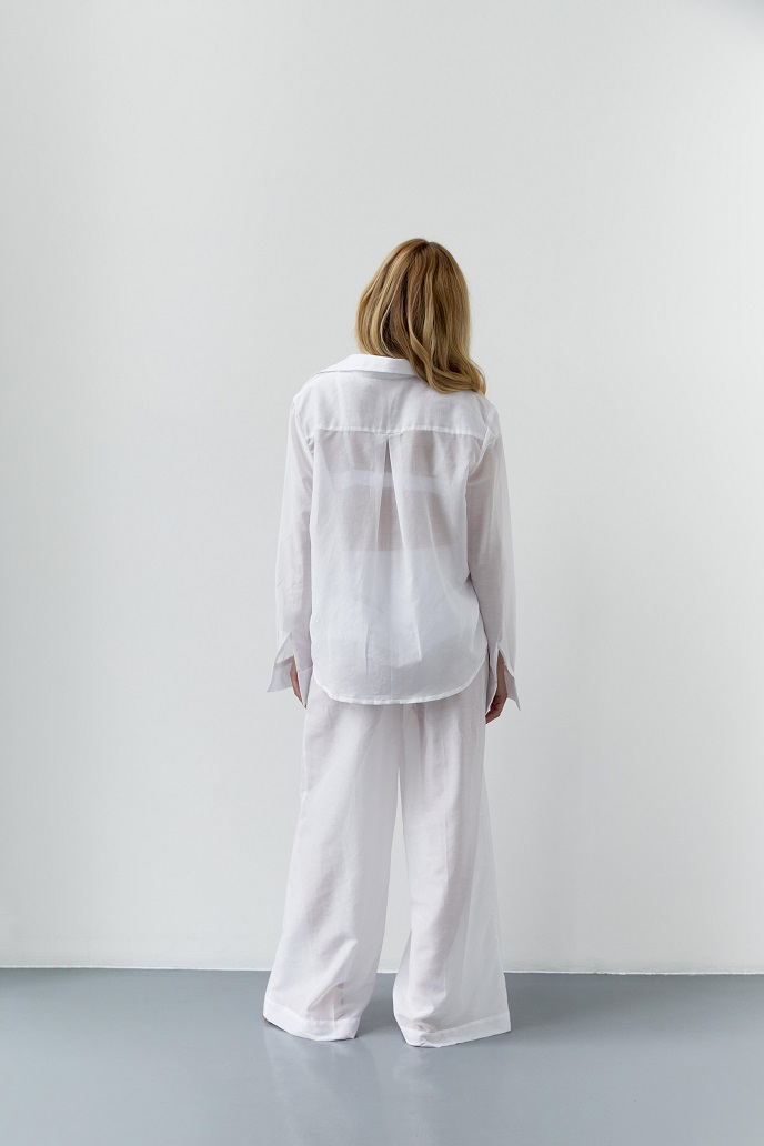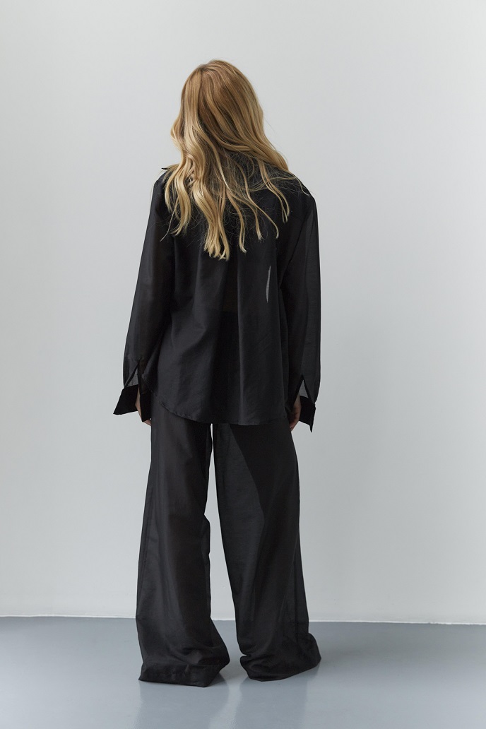 Костюм Like the wind виготовлений з легкої шовкової тканини. Штани оверсайз та вільна рубашка з зав’язкою спереді.