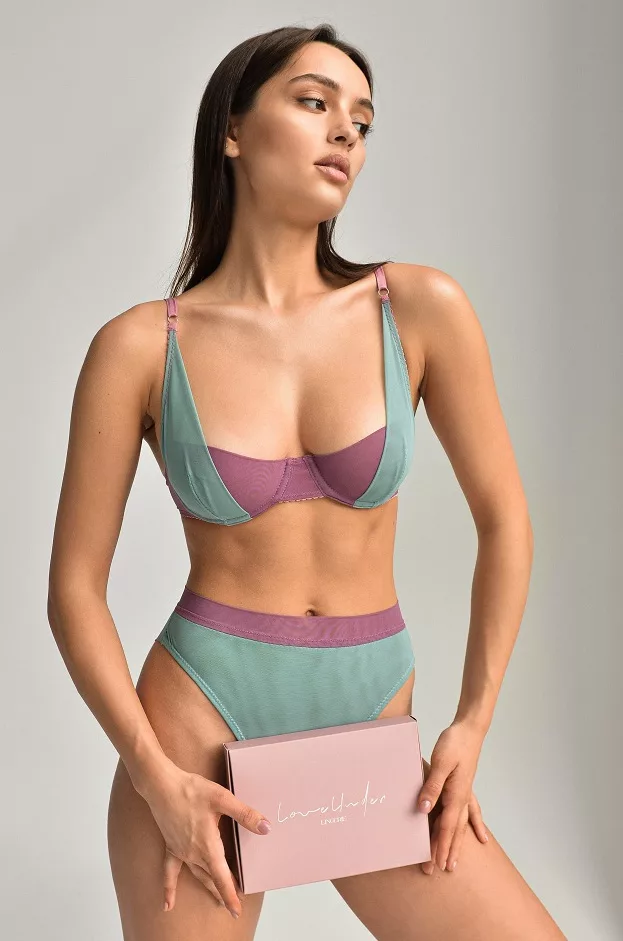 Комплект Mono Sport виконаний з еластичної сіточки з ліфом-топом на каркасах і трусиками стрінг високої посадки.