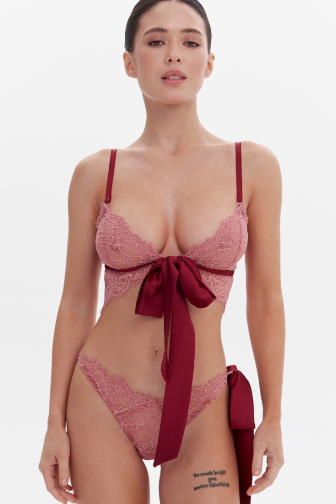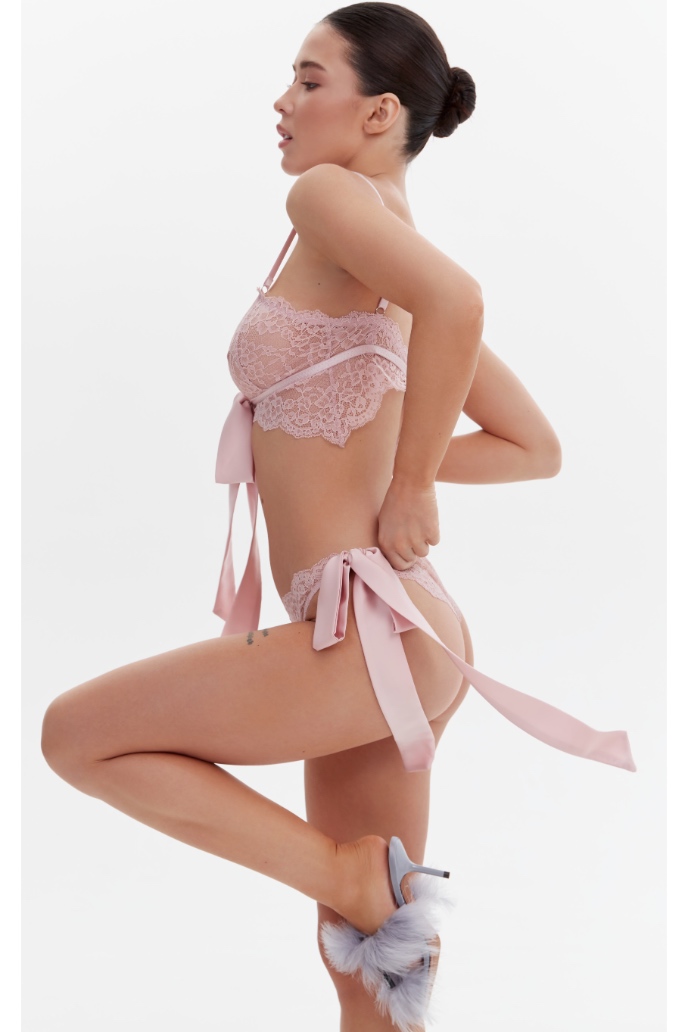 The set includes a wireless bra, brazilian panties, and two removable satin ribbons that can be attached to the set.