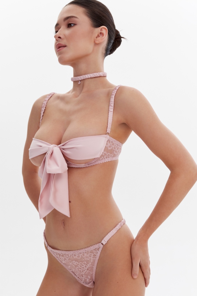 The set includes a choker, an open-cup underwired bra with a ribbon tie detail, as well as two pairs of panties that can be worn separately: adjustable side-strap thong and open-back panties with a ribbon tie detail and adjustable straps at the back.