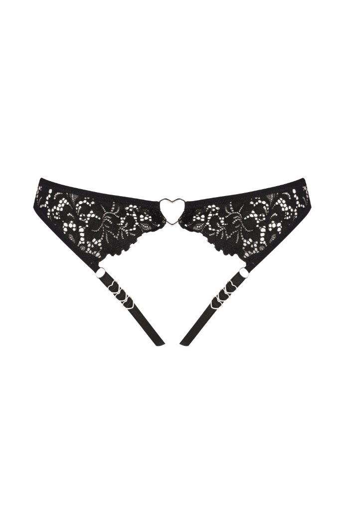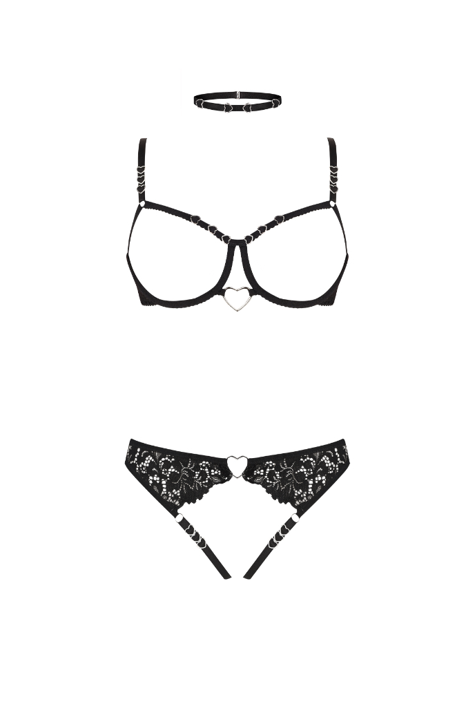 Комплект Hedonist Open виконаний з фактурного мережива, ліф з відкритою чашкою на каркасах та трусики з відкритим доступом і регульованими ремінцями на сідницях. У вартість комплекту також входить чокер.