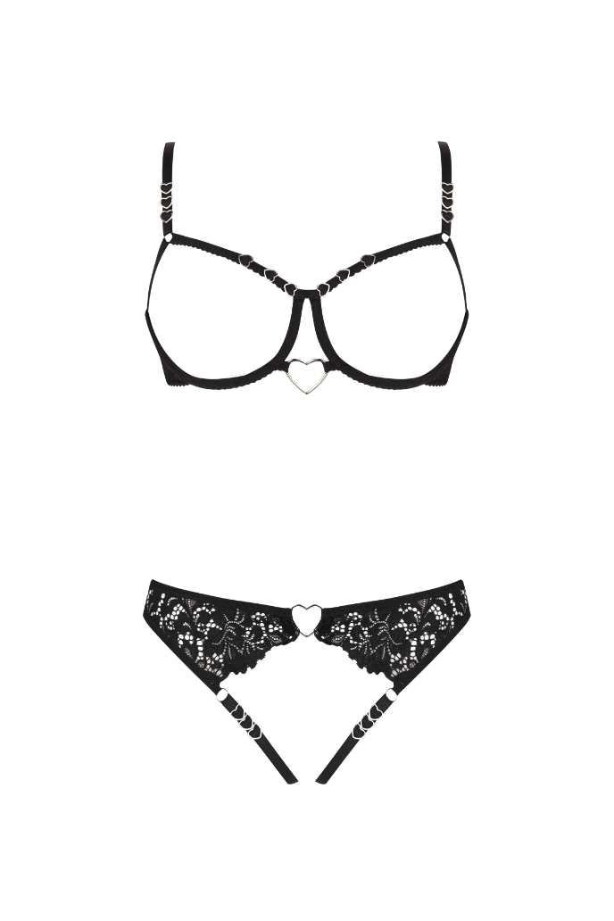 • Комплект Paramour Open Black виконаний з фактурного мережива, ліф з відкритою чашкою на каркасах і верхніми резинками для регуляції. Трусики з відкритим доступом та ремінцями на сідницях.