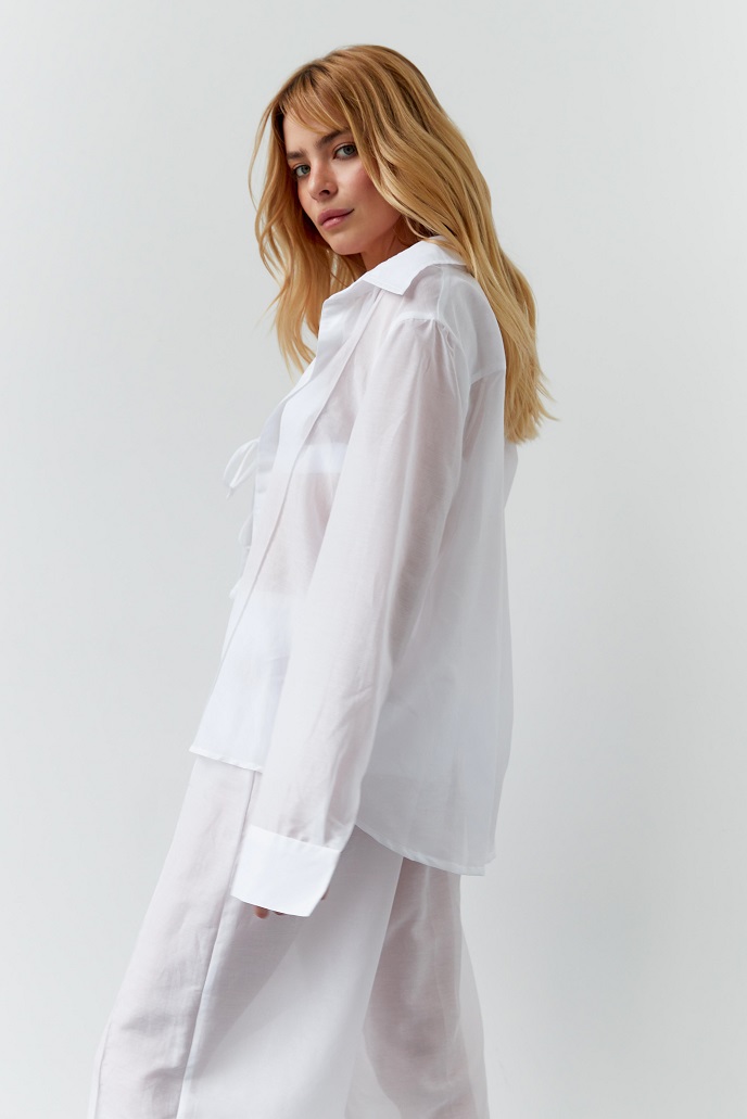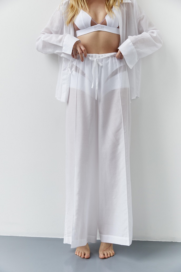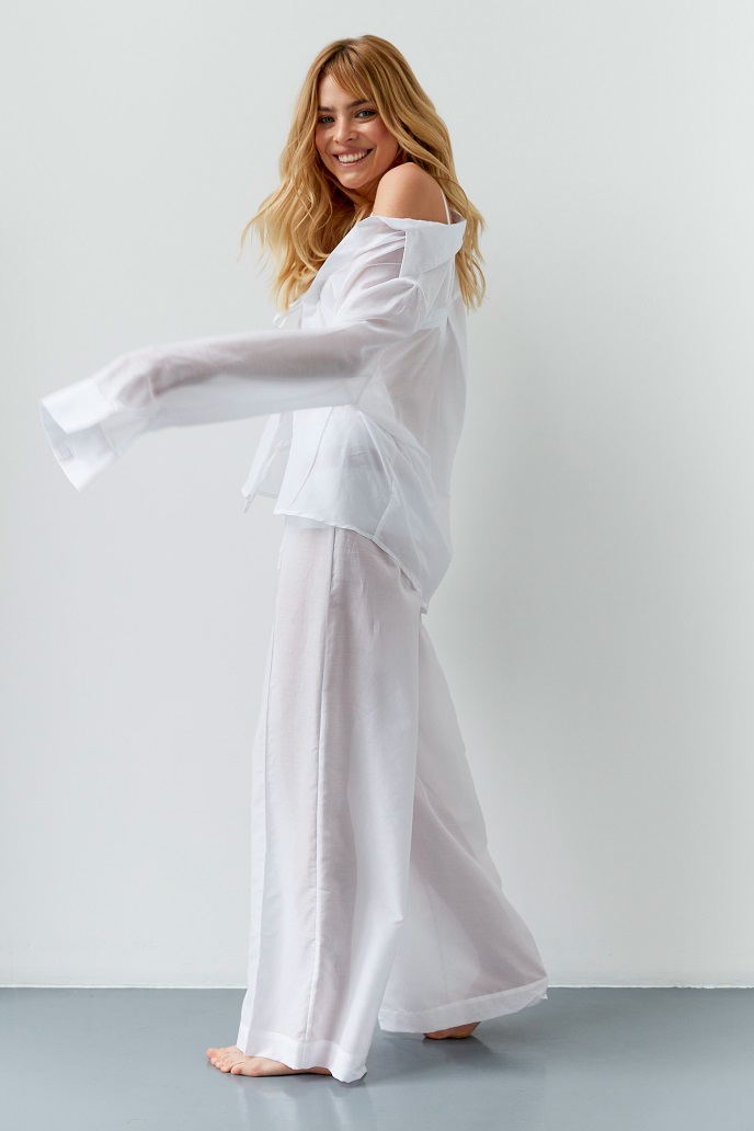 Костюм Like the wind виготовлений з легкої шовкової тканини. Штани оверсайз та вільна рубашка з зав’язкою.