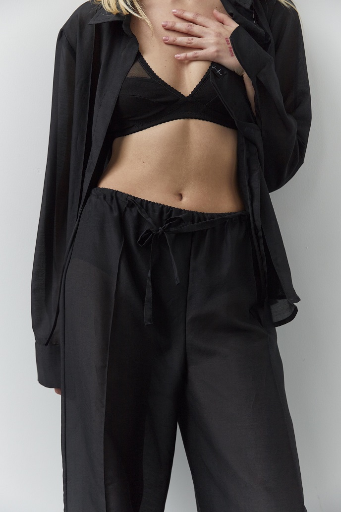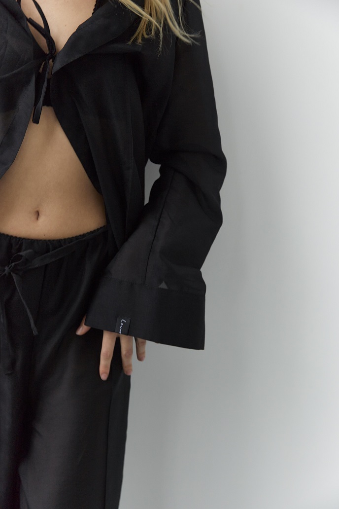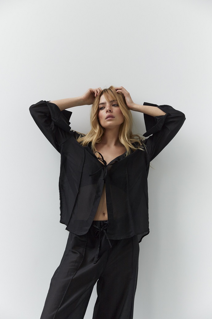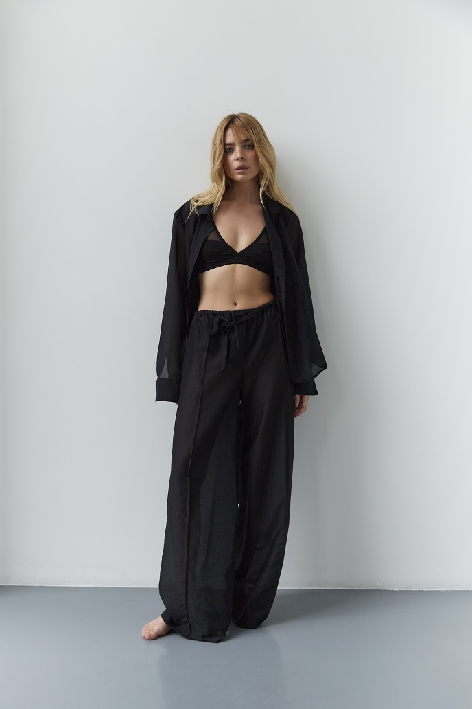 Костюм Like the wind виготовлений з легкої шовкової тканини. Штани оверсайз та вільна рубашка з зав’язкою.