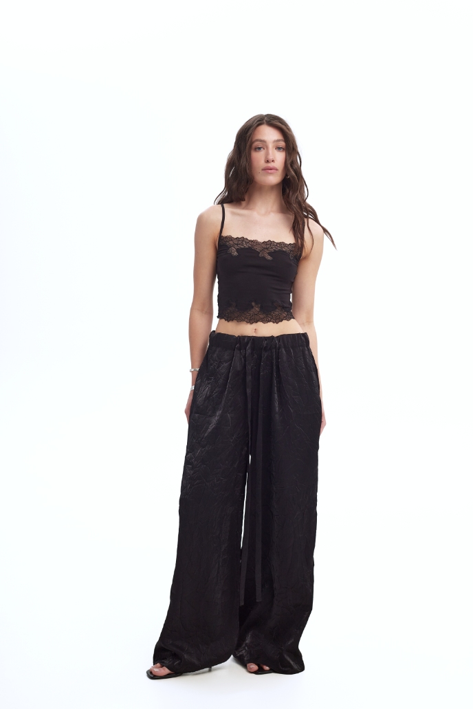 • Костюм Like the wind виготовлений з легкої шовкової тканини. Штани оверсайз та вільна рубашка з зав’язкою спереді.