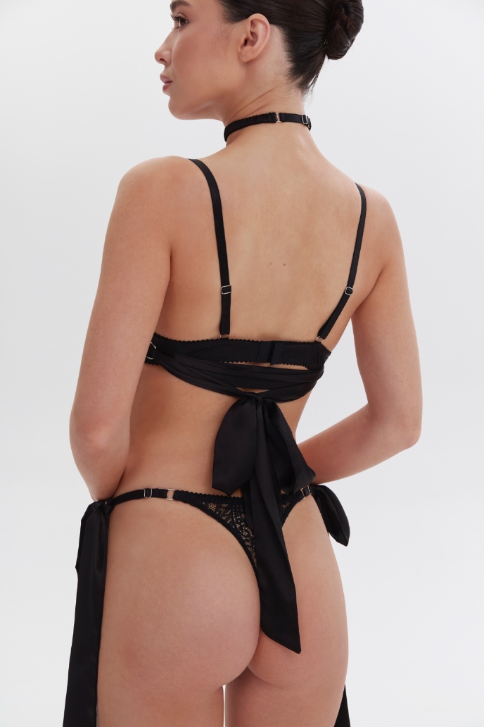 The set includes an open-cup underwired bra with a ribbon tie detail, adjustable side-strap thong, and a matching choker.