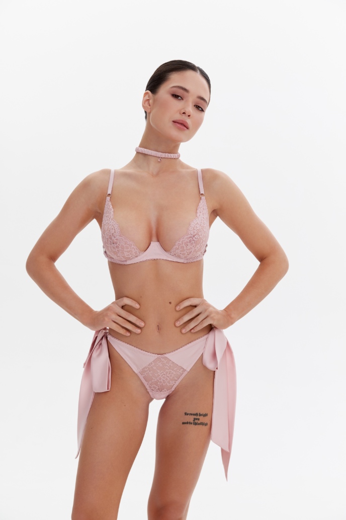 The set includes an underwired bra, adjustable side-strap thong, three removable satin ribbons that can be attached to the set, and a matching choker.