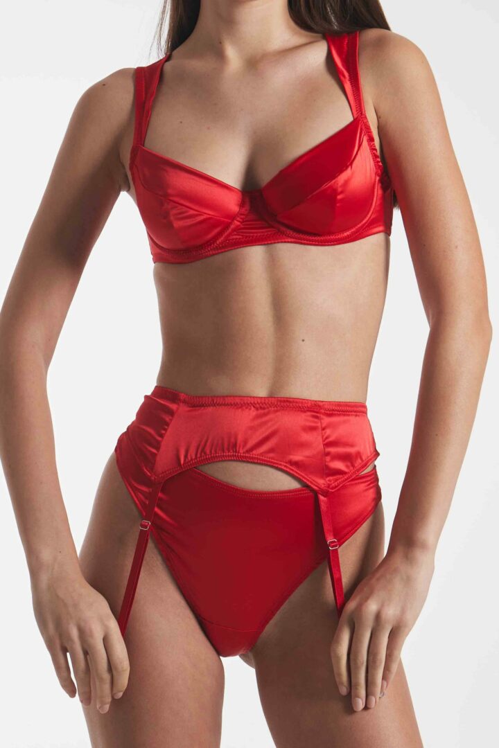 Комплект Tash Red виконаний з сатину, ліф на каркасах з м’якою чашкою та широкими бретелями і трусики стрінг високої посадки. Пояс під панчохи з регуляцією високої посадки на талії.