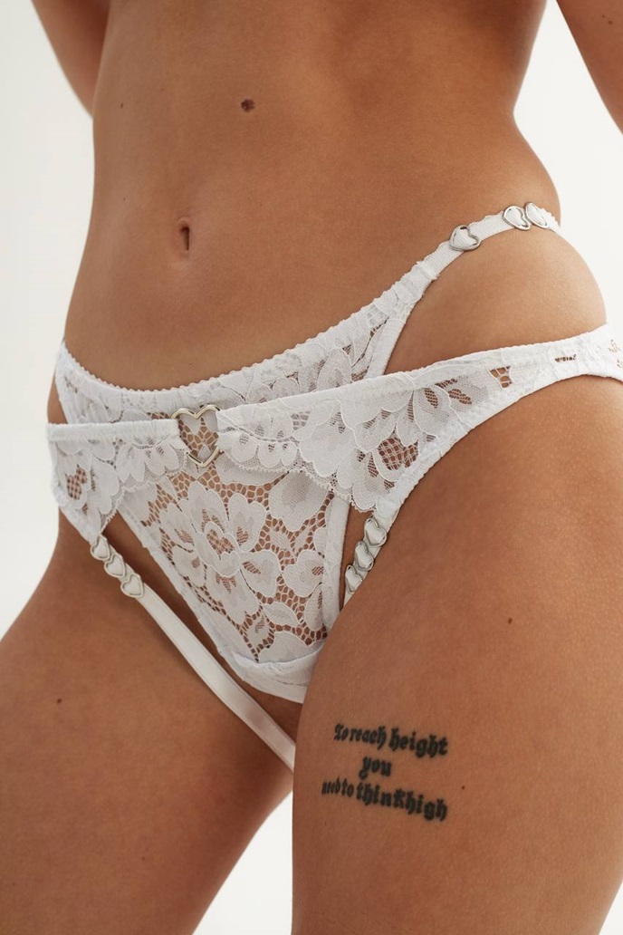 Трусики Hedonist Open з відкритим доступом та ремінцями для регулювання на сідницях, виконані із мережива. Можна носити окремо або поверх стрінгів, як зображено на фото.